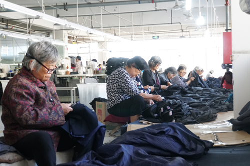 河南沈丘縣永盛服飾有限公司車間內(nèi),在家閑不住的老人們到車間打零工,掙點(diǎn)零花錢 王林園 攝