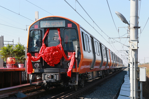 中車(chē)長(zhǎng)春軌道客車(chē)股份有限公司研制的首批美國(guó)波士頓橙線地鐵車(chē)在長(zhǎng)春下線,成為首次登陸美國(guó)市場(chǎng)的國(guó)產(chǎn)軌道交通裝備(2017年10月16日攝)。段續(xù)攝