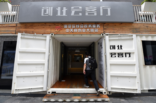一名咨詢者走入位于北京海淀區(qū)中關(guān)村創(chuàng)業(yè)大街的創(chuàng)業(yè)會(huì)客廳。 鞠煥宗 攝