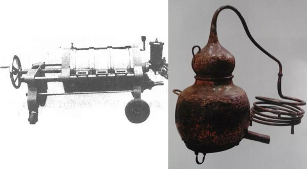 張?jiān)>莆幕┪镳^珍藏有一部銹跡斑斑的老蒸餾器,雖有殘缺,但器形特征非常鮮明,為標(biāo)準(zhǔn)的夏朗德壺式蒸餾器,紅銅材質(zhì),手工打造。