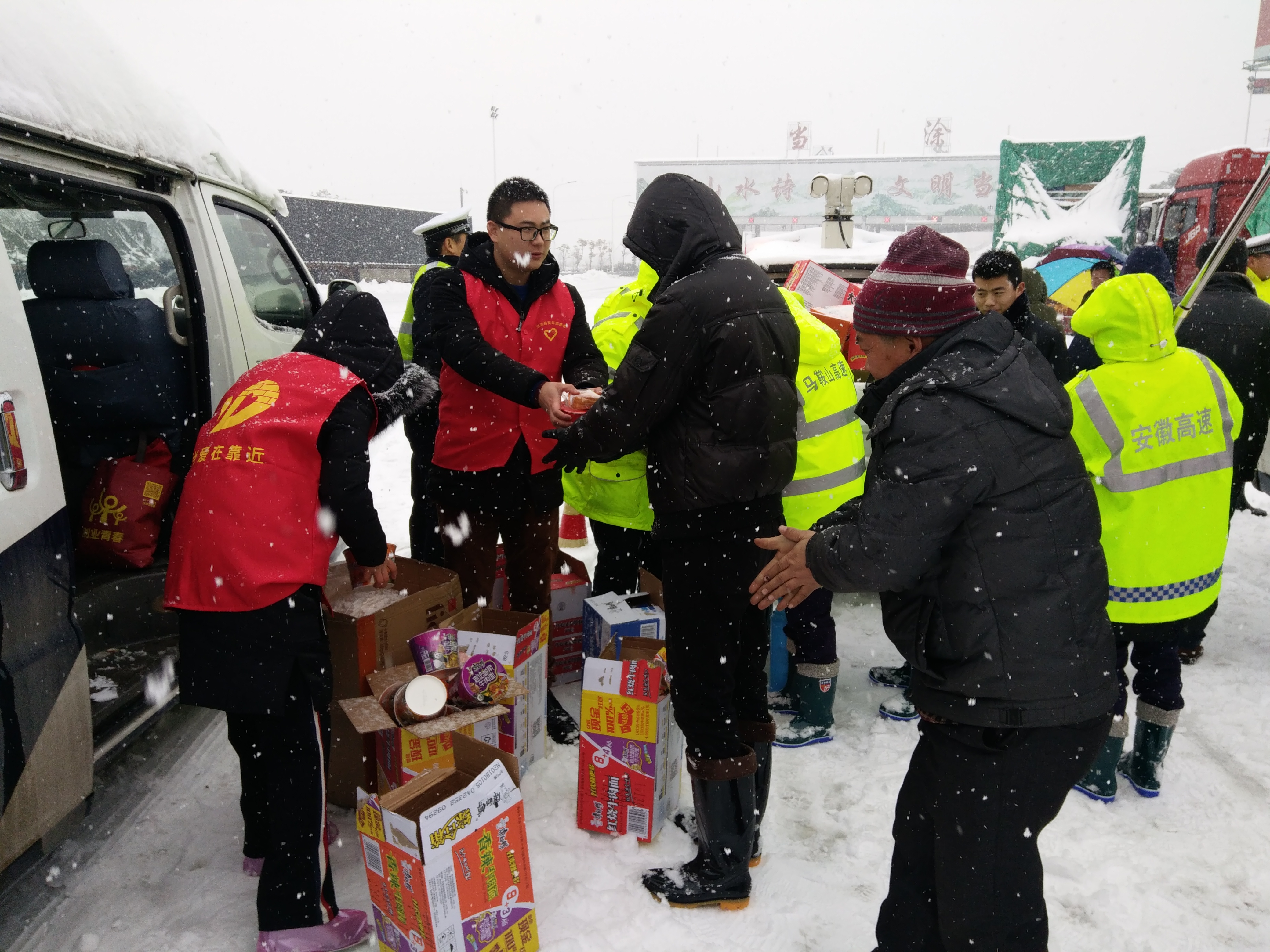 郭武林的故事只是一個(gè)縮影。由于連降暴雪,全市道路最大積雪深度達(dá)到28厘米,由于道路封閉,滯留在馬鞍山市各高速公路出入口的車輛超過1000臺(tái)。就在2000余名司乘人員面對(duì)饑寒交迫的困境時(shí),馬鞍山市志愿者們出現(xiàn)在了風(fēng)雪中,為滯留人員送來了熱水和食物,還有一張張溫馨提示的宣傳單。