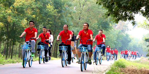 2017年9月17日,在山東東營市東營區(qū)城南風(fēng)景旅游度假區(qū),青年志愿者在參加環(huán)保騎行活動(dòng)-劉智峰-攝