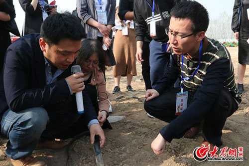 宋學(xué)東(左)向記者講解滴灌系統(tǒng)