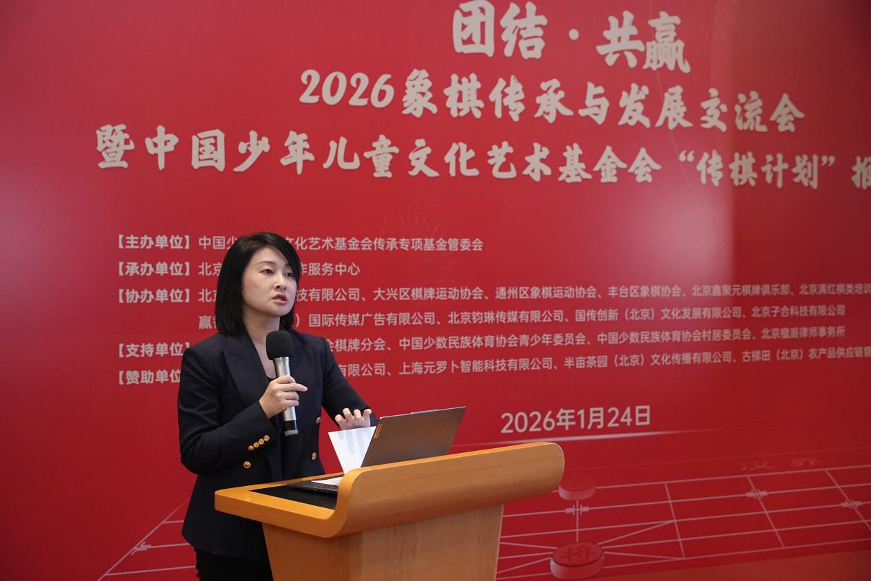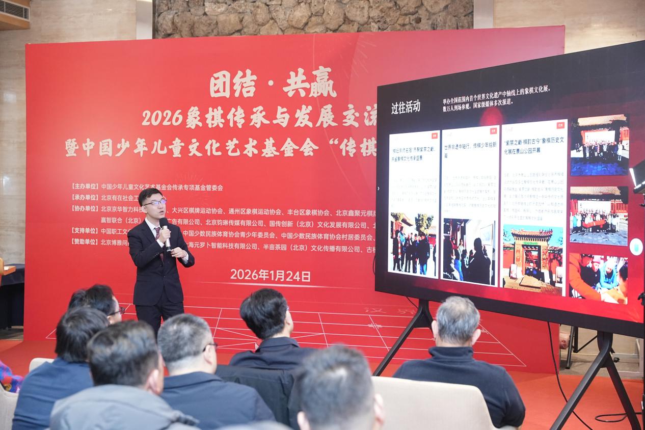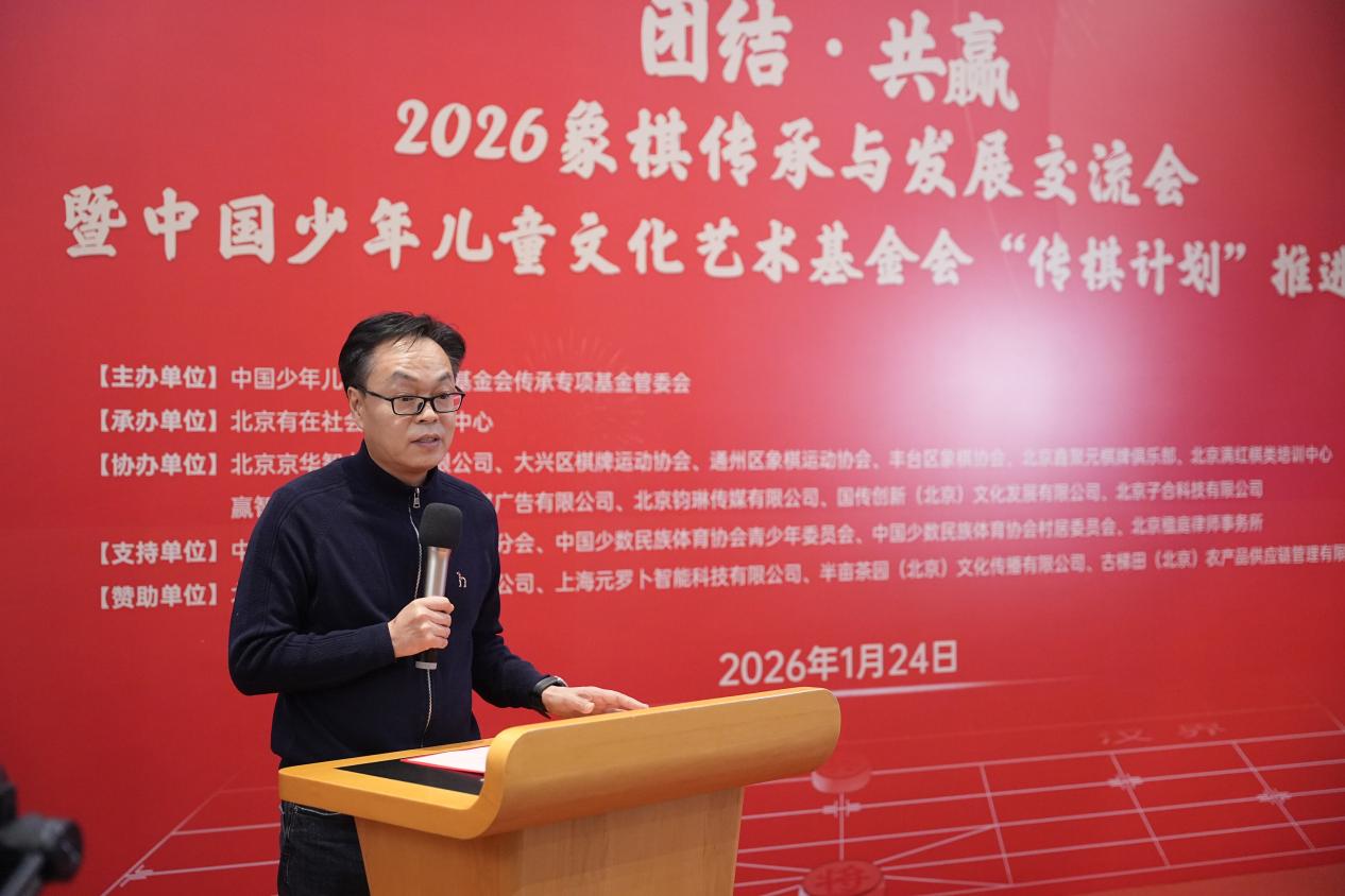 1 月 24 日,由中國少年兒童文化藝術(shù)基金會傳承專項(xiàng)基金管委會主辦的“團(tuán)結(jié)?共贏”2026象棋傳承與發(fā)展交流會暨“傳棋計(jì)劃”推進(jìn)會在北大博雅國際酒店舉行。